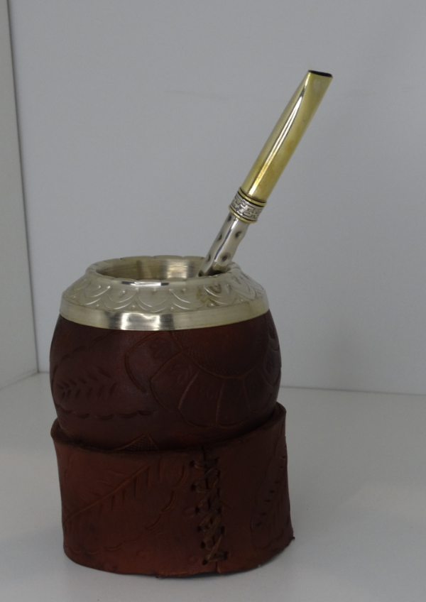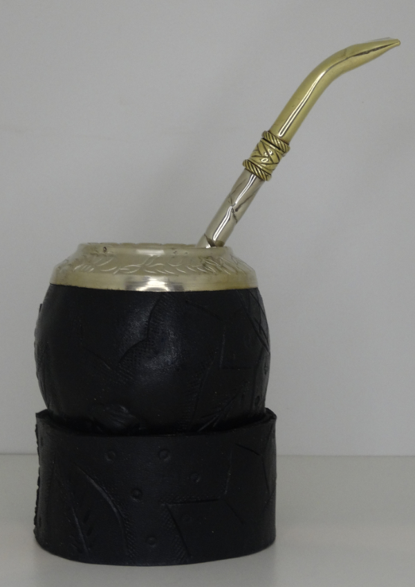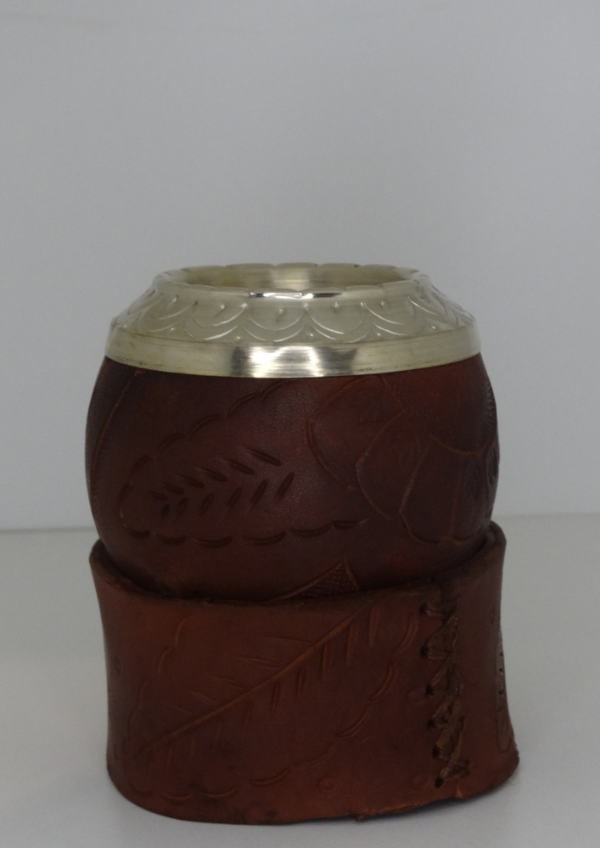 El mate torpedo con virola de alpaca cincelada, cuero tallado y base de cuero tallado es una verdadera obra de arte criolla. De tamaño mediano y cuerpo curvo, su silueta ergonómica se adapta perfecto a la mano, combinando comodidad con elegancia tradicional.